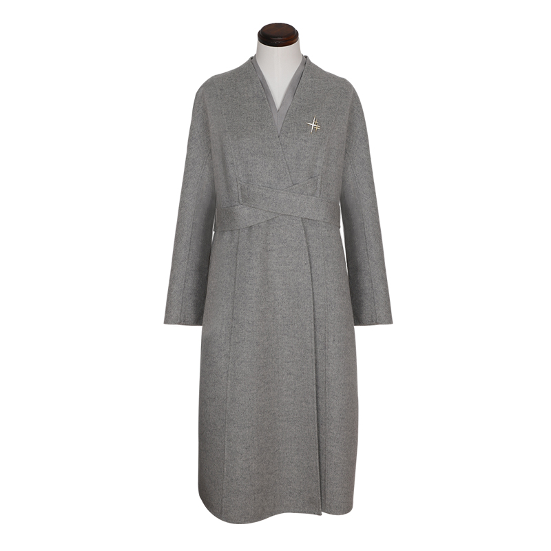 商品名称:银灰色V领立体交叉腰带女士中长款大衣