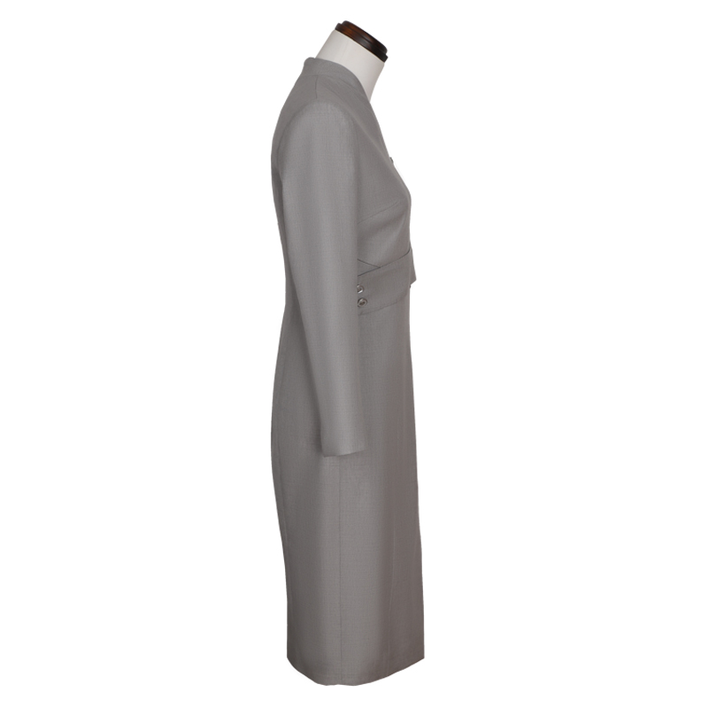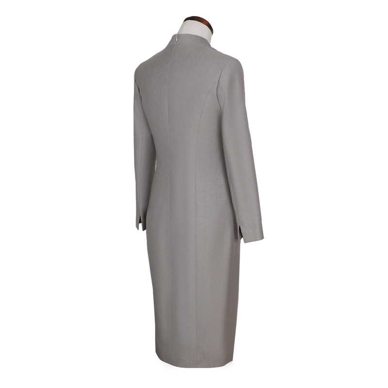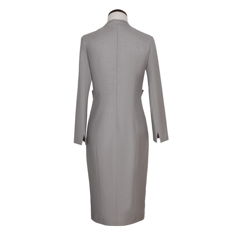 银灰色V领立体交叉装饰腰带女士中长款连衣裙,腰部增设腰带设计,凸显亮点,提高层次。